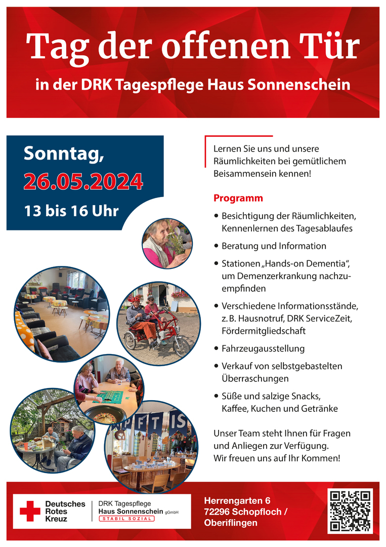 Die DRK Tagespflege Haus Sonnenschein des DRK Kreisverbandes Freudenstadt e.V. öffnet am Sonntag, 26. Mai 2024, von 13 bis 16 Uhr ihre Türen für die Öffentlichkeit.